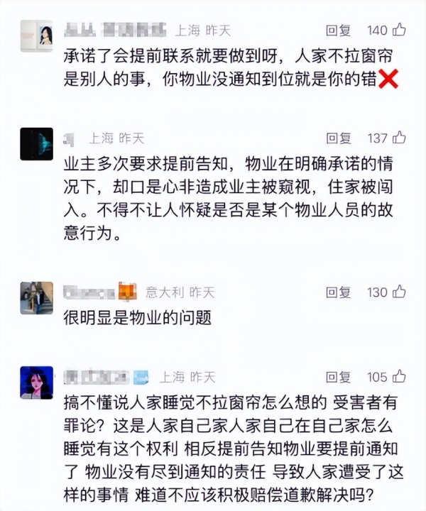 有人认为公寓方难辞其咎,业主多次要求提前告知,管家在明确承诺后却未能给到任何提前提醒,没将消息及时通知到位导致业主被窥视,显然失职失责,存在明显过错。