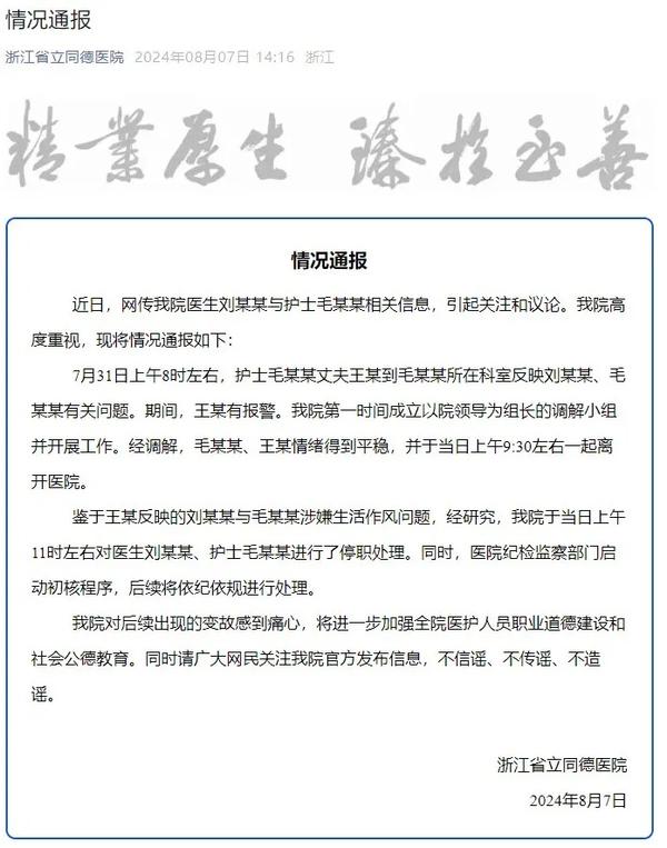 大皖新闻记者注意到,王越家人在网上发帖反映此事后,很快引发关注。8月7日,浙江省立同德医院发布情况通报称:7月31日上午8时左右,护士毛某某丈夫王某到毛某某所在科室反映刘某某、毛某某有关问题。期间,王某有报警。医院第一时间成立以院领导为组长的调解小组并开展工作。经调解,毛某某、王某情绪得到平稳,并于当日上午9:30左右一起离开医院。鉴于王某反映的刘某某与毛某某涉嫌生活作风问题,经研究,该院于当日上午11时左右对医生刘某某、护士毛某某进行了停职处理。同时,医院纪检监察部门启动初核程序,后续将依纪依规进行处理。
