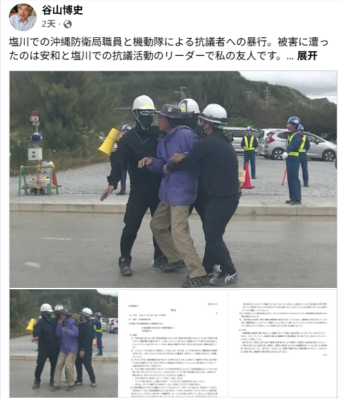 谷山Facebook账号近日更新:"在盐川发生的日本防卫省冲绳防卫局职员及机动队对抗议者实施暴力的事件。受害者是安和与盐川抗议活动的领导者,也是我的朋友。"