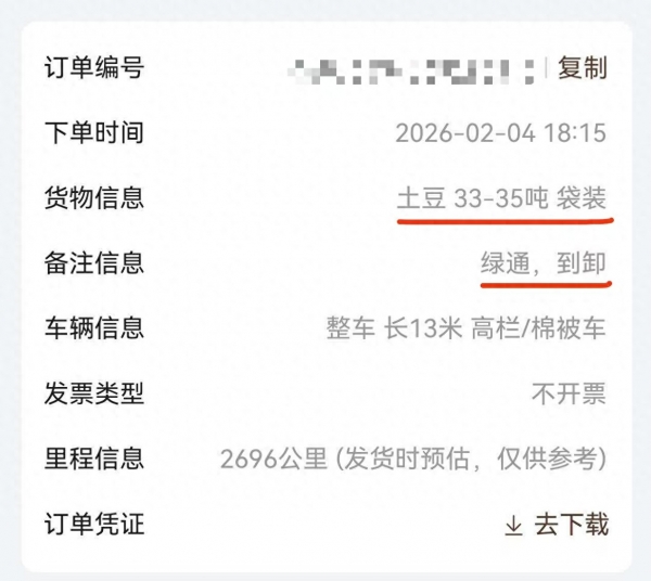 事情起因是近日杨昆在平台上接到一个订单。2月6日,他从呼伦贝尔市牙克石市免渡河镇装了一车33~35吨袋装的土豆,准备送往陕西商洛市。据杨昆提供的订单信息截图,订单上明确写着货物为"土豆",备注着"绿通、到卸"。