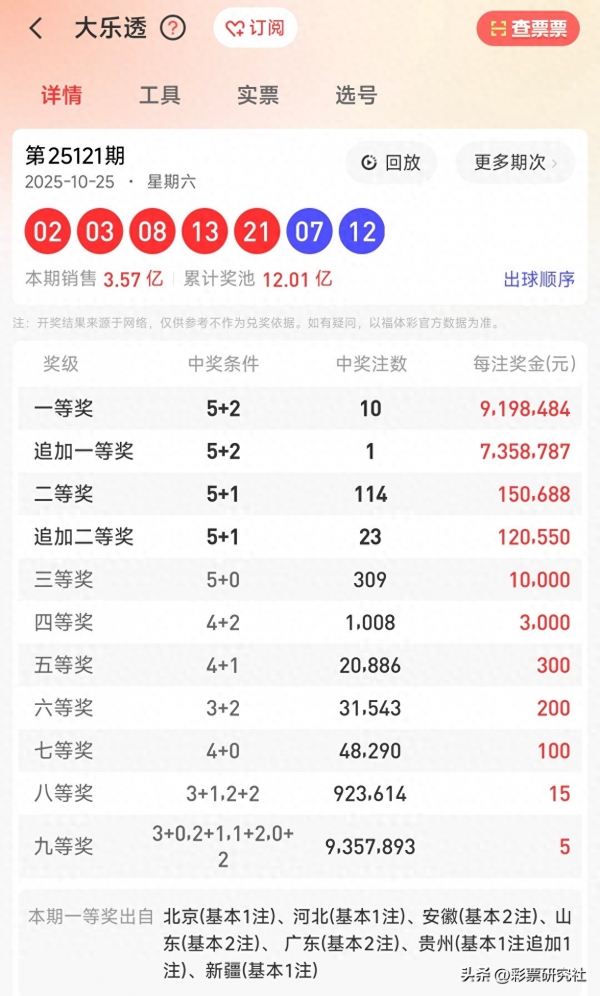 2025年10月25日星期六,大乐透第25121期开奖结果火热出炉,全国彩民目光聚焦。本期开奖号码为前区02、03、08、13、21,后区07、12,一组看似平淡却造就千万惊喜的组合,搅动了3.57亿销售额的市场,也让累计奖池攀升至12.01亿大关。