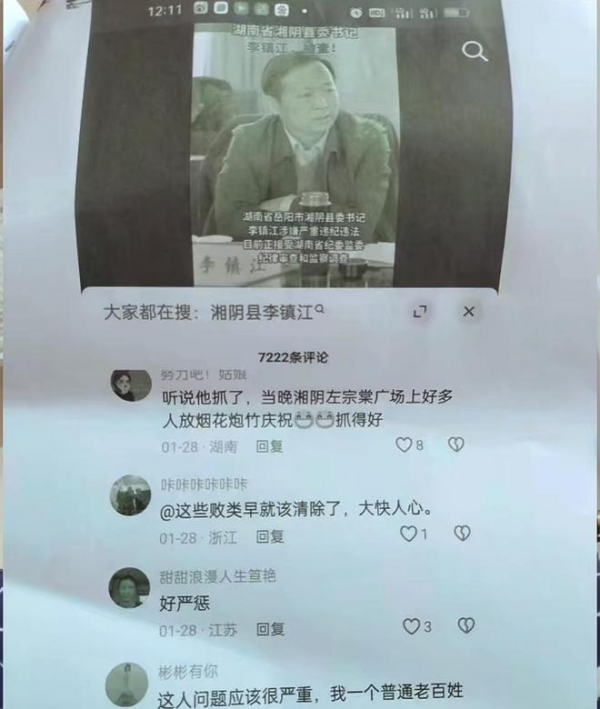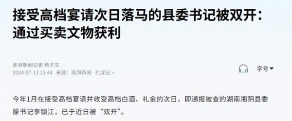 县委书记李镇江。2024年1月因涉嫌严重违纪违法被湖南省纪委监委通报并立案调查。2024年7月,经湖南省委批准,李镇江被"双开",并将涉嫌犯罪问题移送检察机关。