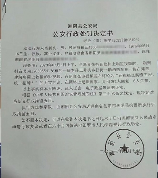 肖先生,湖南湘阴人。2023年7月,在一条网络视频下发布了12个字的评论"还在搞豆腐渣工程,统一招牌?"获得了几个点赞几条追评,被湘阴县公安局认定为寻衅滋事并处以拘留5天的处罚。