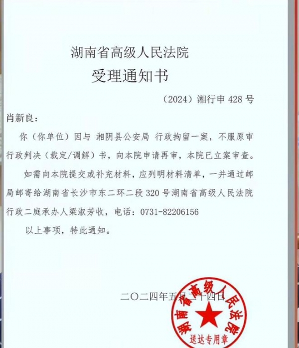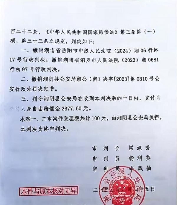 2024年5月,肖先生再次向湖南省高院申请再审。2025年6月,省高院组织肖先生与湘阴县公安局两方进行调解。最终肖先生获得了2300余元的赔偿金。