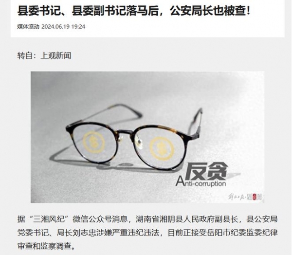 公安局局长刘志忠,2024年6月因涉嫌严重违纪违法接受纪律审查。此前,湘阴县委副书记、政法委书记张奕也于2024年早些时候被查。