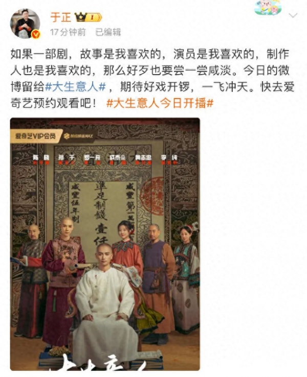 11月25日,陈晓、孙千领衔主演的古装传奇剧《大生意人》开播。于正发博为陈晓宣传新剧。
