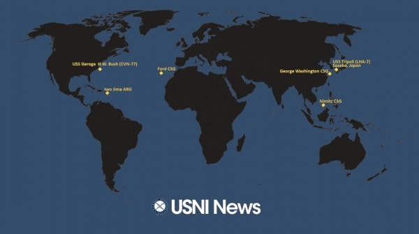 另一方面,由于"福特"号的离开,美国海军在从欧洲到马六甲海峡之间的地中海、印度洋海域再次出现了大面积的"航母真空",而在全球范围内可活动的航母部队数量也仍算不上多,根据美国海军学会新闻网(USNI News)上"舰队与海事追踪"频道上本月10日更新的态势图显示,仍在海上活动的航母仅有在南海南部的CVN-68"尼米兹"号、刚刚结束在韩国釜山访问正在东海航行的CVN-73"乔治·华盛顿"号、正在大西洋上航渡的CVN-78"福特"号与本月3日刚刚从诺福克出港的CVN-77"乔治·H·W·布什"号。