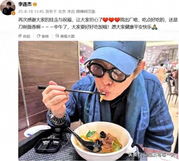 第二天中午照片又来一张,李连杰出院,刀削面端在手里,热气把镜头糊了一层,配字出厂第一顿还是这口最香,都给我好好吃饭听见没,照片里根本不像刚住院的人,评论区有调侃这碗面能炫三碗,也有直接刷平安祝福的,大家看着照片,感觉挺有意思,眼里有光。