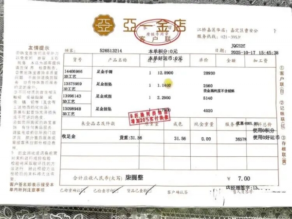 2025年9月,有网友表示,在某金店以旧换新的过程中,也遭遇了"付出的多、收获的少"的情况:"导购没有告知饰品多重,发票上没有体现金子的重量。等我反应过来去退货时,就说不能退了。"