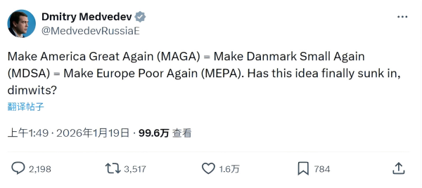 1月19日,俄罗斯前总统、安全委员会副主席梅德韦杰夫在社交媒体发文称,"让美国再次伟大(MAGA)=让丹麦再次变小(MDSA)=让欧洲再次贫穷(MEPA)。你们终于明白了吗,笨蛋们?"梅德韦杰夫的社交媒体