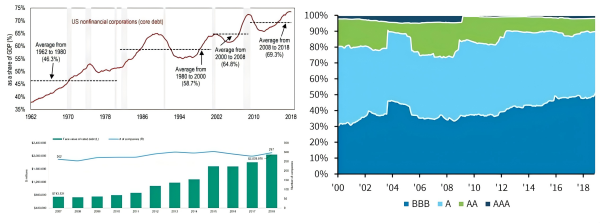 美国非金融企业债务占GDP的比例在半个世纪中翻了一番(左上),2008年金融危机后,短短十年时间,BBB级债务扩张三倍(左下),A级以上的债券规模占比压缩(右)。美国的杠杆策略更为激进 HSBC,Moody,Factset
