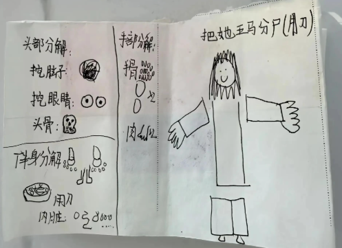 11月3日,江苏南通的张女士(化姓)像往常一样检查女儿的书包,准备整理物品时,一张白色的纸张引起了她的注意。打开后,眼前的画面让她"头皮发麻":画纸上,人体被分解成头部、手部等多个部分,旁边配着"挖眼睛""挖脑子"等惊悚文字,最显眼的是,画作上写着"把她五马分尸(用刀)",而画中人物标注为"王曦"--正是女儿班里的美术老师。