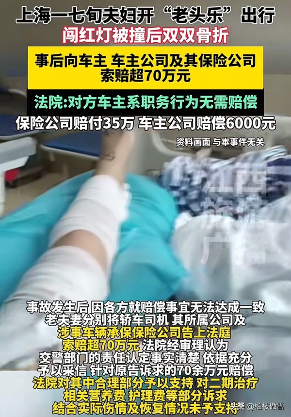 2026年1月,上海虹口法院审理了一起交通事故案件,沈大妈驾驶无牌照、无驾照、无保险的电动代步车,在中山北一路与广中路路口闯红灯,撞上李小姐正常行驶的轿车,事故导致沈大妈双椎体骨折及七根肋骨断裂,黄大爷十根肋骨断裂,两人均构成伤残。
