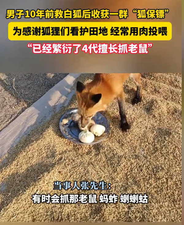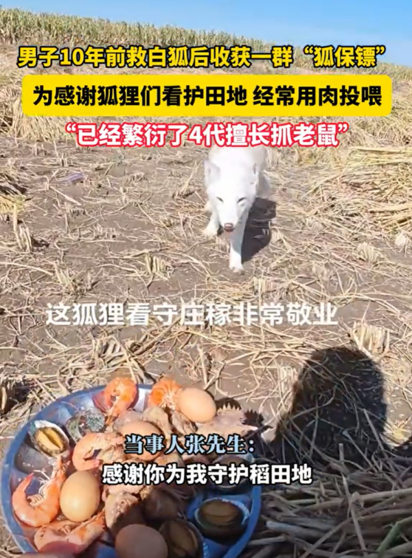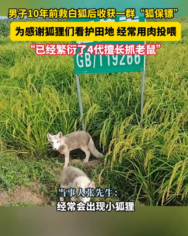 近日,哈尔滨一男子在网上晒出视频,称自己10年前曾经救下来一只白狐狸,后来给狐狸投喂食物,如今,男子收获了一群"狐狸保镖",已经繁育了四代,擅长在田地里帮忙抓老鼠。