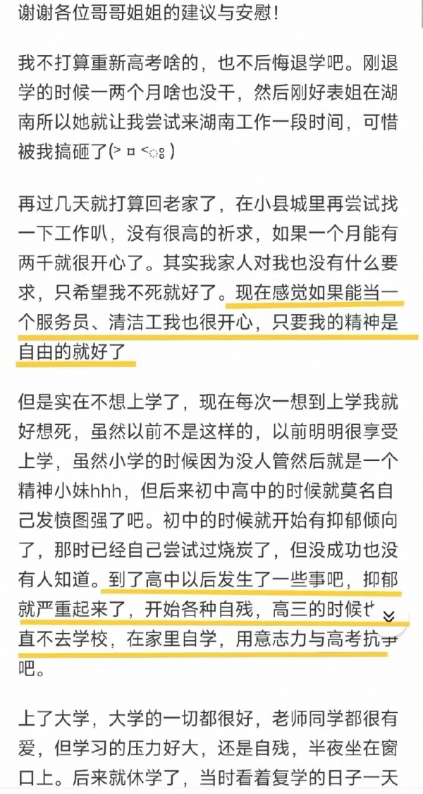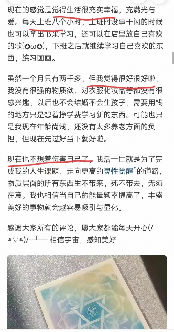 不过,这篇帖子中,符同学表现出来的心态还是挺积极的,如果她的心态一直都是这样该多好,那她就不会再轻生了。