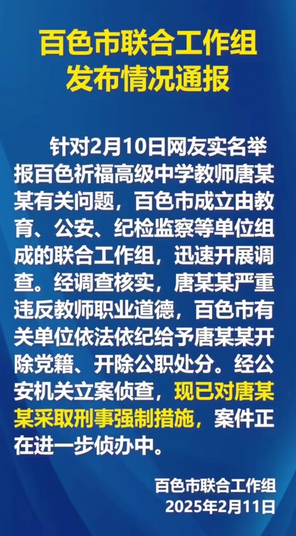 官方通报表示,教师唐某某被双开,还对其采取了刑事强制措施。