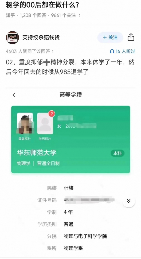 令人扼腕叹息的是,该女生不仅人长得漂亮,她的学习成绩还非常好,中考以全县第一名的成绩考入重点高中,而且她后面在已经被抑郁症困扰了很久并经历过退学的情况下,复读后仍然考上了 985 的华东师范大学,可以说她是名副其实的学霸。