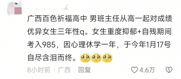近日,广西百色某重点高中教师唐某某被举报性侵未成年女学生,导致女生重度抑郁轻生结束了自己的生命,在网上闹得沸沸扬扬。