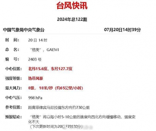 此前,据@中央气象台、@福建气象预测,菲律宾以东热带低压(3号台风"格美")最强可达强台风级或超强台风级(50米/秒-58米/秒,15级-17级),并逐渐向台湾岛东部海面靠近,之后将趋向华东沿海,24日起影响福建省外海渔场。