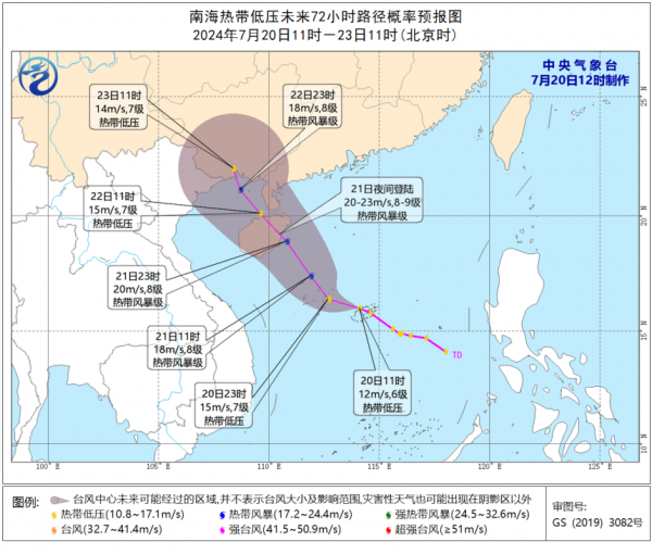 南海热带低压已于19日14时生成,20日8时中心距离海南省三沙(西沙永兴岛)东偏南方向约265公里(北纬15.8度、东经114.6度),中心附近最大风力6级(12米/秒),预计低压中心将以每小时20公里-25公里的速度向西偏北方向移动,将于21日夜间在海南岛东部到广东西部一带沿海登陆,登陆时强度可达热带风暴级(8级-9级,20米/秒-23米/秒),未来对福建省无影响。