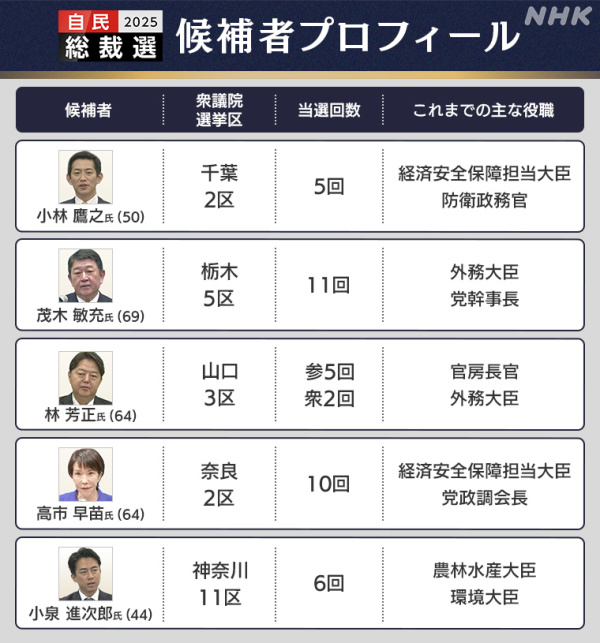 5名自民党总裁候选者的基本信息 NHK