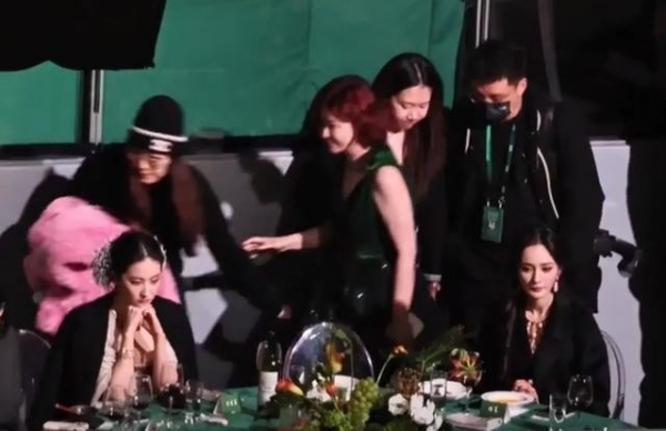 时间往前倒几个小时,在大合照环节,故事就已经开始了。当时大部分明星都已经在台上找好了自己的位置,就等着最关键的几个人物登场。