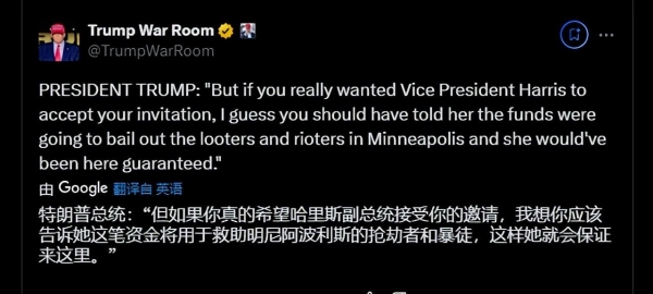 特朗普:"但如果你真的希望哈里斯接受你的邀请,我想你应该告诉她这笔资金将用于救助明尼阿波利斯的抢劫者和暴徒,这样她就会保证来这里。"