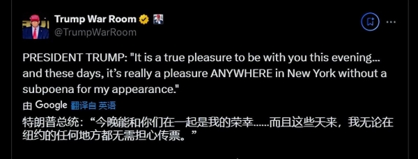特朗普:"今晚能和你们在一起是我的荣幸……而且这些天来,我无论在纽约的任何地方都无需担心传票。"