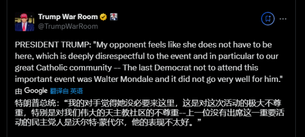 特朗普:"哈里斯觉得她没必要来这里,这是对这次活动的极大不尊重,特别是对我们伟大的天主教社区的不尊重--上一位没有出席这一重要活动的民主党人是沃尔特·蒙代尔,他的表现不太好。" 意思是哈里斯的表现当下也差得很。