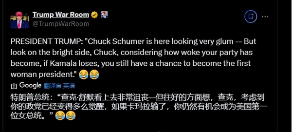 特朗普:"查克·舒默看上去非常沮丧--但往好的方面想,查克,如果哈里斯输了,你仍然有机会成为美国第一位女总统。"