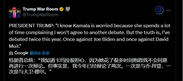 特朗普:"我知道哈里斯很担心,因为她花了很多时间抱怨我不会同意再进行一次辩论。但事实是,我今年已经辩论了两次。一次是与拜登,一次是与主持人大卫·穆尔。"