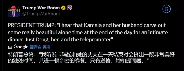 特朗普:"我听说哈里斯和她的丈夫在一天结束时会挤出一段非常美好的独处时间,共进一顿亲密的晚餐。只有道格、她和提词器。"