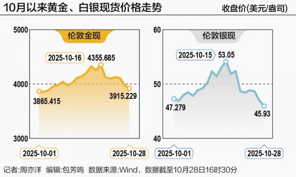 黄金大跌的同时,"小兄弟"白银也跟着出现跳水走势,隔夜大跌3.36%之后,10月28日亚洲交易时段继续走低,已经下跌2.2%。本月白银现货价格已经从54.453美元/盎司,跌至46美元/盎司附近,最大回撤达到16%。年内涨幅也从最高85%,回落至58%。