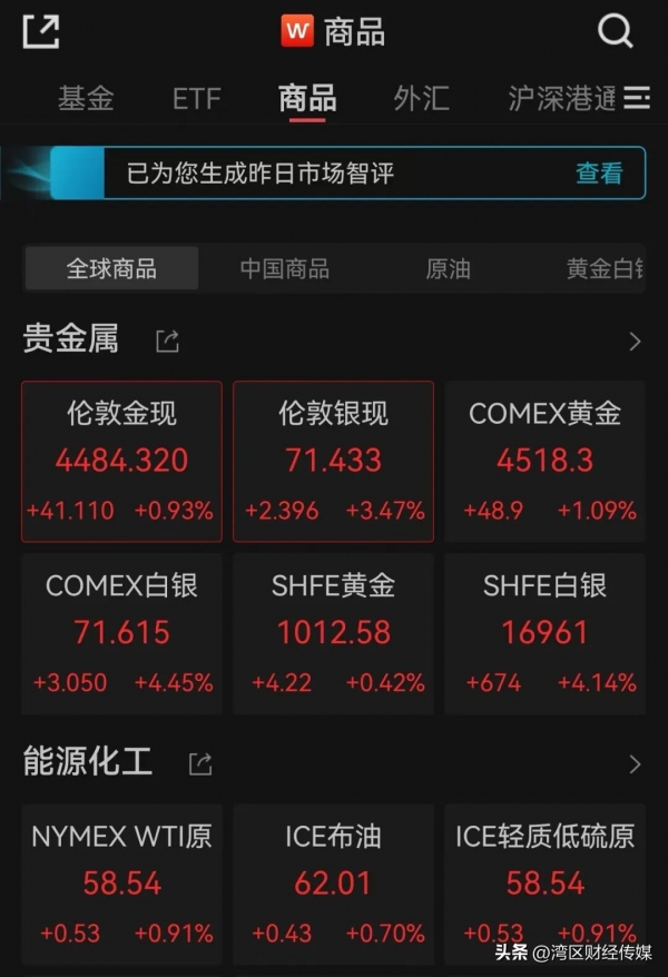 大宗商品方面,国际市场上,黄金、白银价格双双刷新历史纪录,铜价同步创出新高,铂、钯等贵金属全面走强。