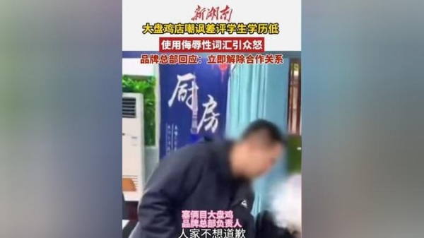 12月26日,甘肃兰州。一高校门口的大盘鸡店,因使用侮辱性言论回复学生差评引发众怒。商家在回复中嘲讽学生"学历低",并恶意揣测其"毕业后只能送外卖、进电子厂",被指公然进行职业歧视,严重伤害学生情感。事件发酵后,大量学生发帖抵制。