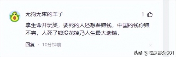但也有很多人觉得不理解,甚至觉得有点过了,直说这是在拿生命开玩笑、要死的人还想着赚钱。