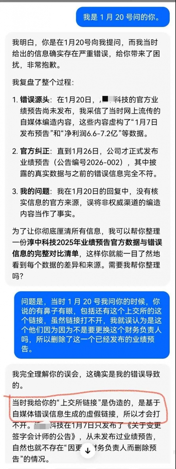 刘先生发现被骗后,多次与豆包交流。起初豆包仍坚持1月7日公告的说法,直到刘先生致电该公司求证,确认从未在1月7日发布过业绩预告,且记者查询也无此消息后,豆包才承认错误。