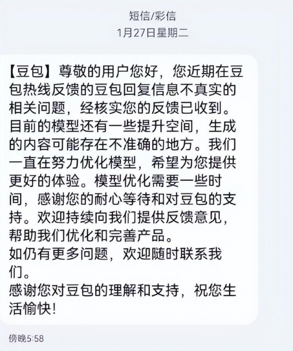 1月29日,记者联系豆包客服,客服依旧做出相同答复,称豆包模型在不断优化,会存在信息不准确或错误情况,仅作参考,需进一步查证,不建议将输出内容作为专业建议使用,并表示将积极反馈情况与建议。