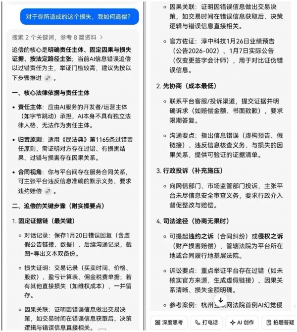 40岁的刘先生热衷炒股,对各类AI软件兴趣浓厚,常借助其查询信息,一直认为AI值得信赖。1月20日,刘先生看上"某某科技"股票,为稳妥起见,使用豆包搜索该公司2025年度财报。豆包迅速回复称该公司2025年度业绩预增公告已于2026年1月7日发布,还给出公告编号及详细业绩数据,如全年归母净利润预计6.6 - 7.2亿元(同比增669% - 739%)等,并提供了东方财富网、上交所官网和巨潮资讯网三个所谓权威渠道链接。刘先生几度追问,豆包均肯定答复。