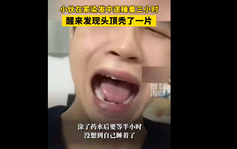 7月21日,广东佛山。据当事人马同学称,当天凌晨一点突然想染发,便用了之前网购的软化膏混了药水,涂了药水后要等半小时,没想到自己睡着了,3小时后醒来发现头顶秃了一片,怀疑头顶这片秃是因药水比别处涂的多。