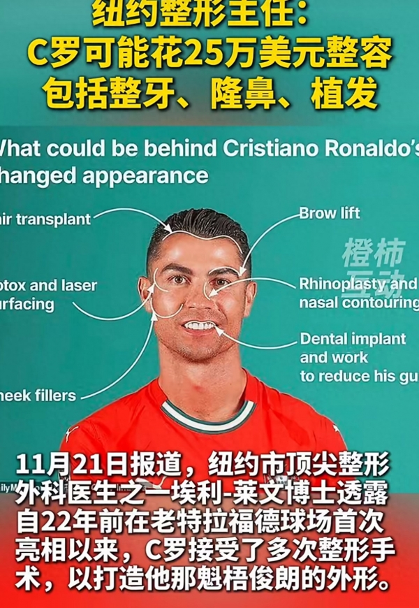 然而,2024 年 11 月 21 日一则消息掀起轩然大波。纽约市顶尖整形外科医生之一埃利・莱文博士透露,自 22 年前 C 罗在老特拉福德球场首次亮相以来,这位前锋据称接受了多次整形手术,以打造他那魁梧俊朗的外形,整容项目包括整牙、隆鼻、植发等,总费用可能高达 10 万美元甚至 25 万美元 ,而 C 罗的代表未回应置评请求。这一爆料瞬间点燃舆论,球迷和大众纷纷加入这场关于 C 罗是否整容的激烈讨论。