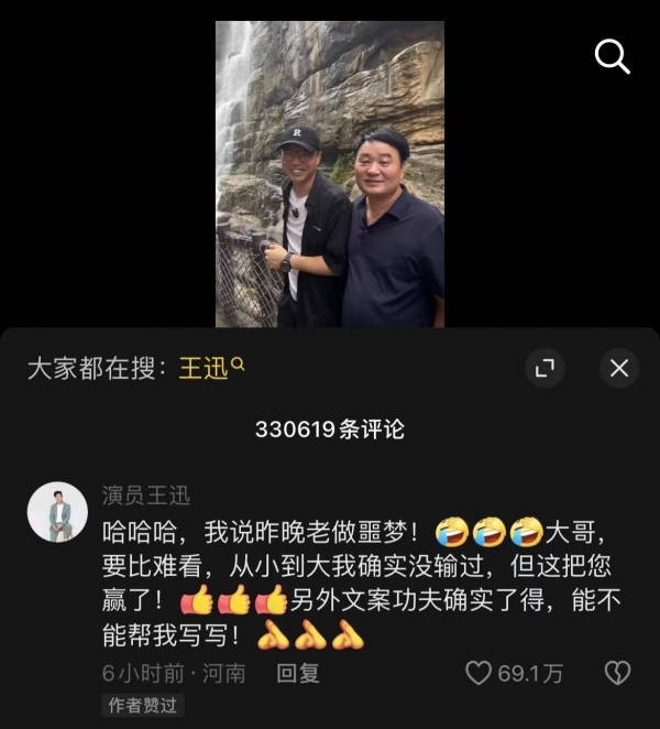 8月8日中午,网名为"镜湖酒行"的网友晒出在景区游玩偶遇王迅的合影,配文"跟我一样难看",获得近百万网友点赞。