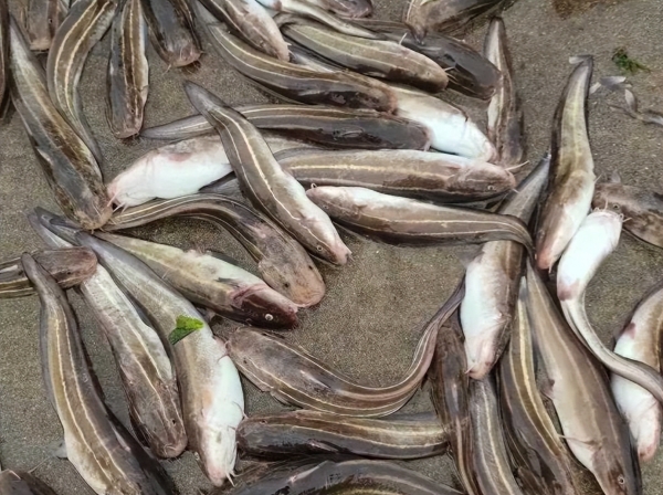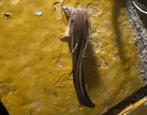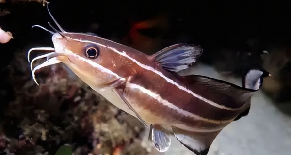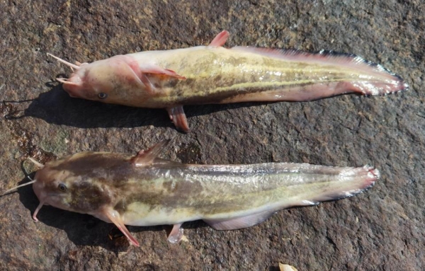 视频中可以看到一个钓友坐在岸边的礁石上,他提着一条鱼展示。我们只能看到这条鱼的侧面和底部。这条鱼的身体细长,头部平扁,腹部圆润,后半身侧扁,一看就是鲇形目的物种;其体侧是棕灰色,隐约可见两条醒目的奶油色纵带,腹部则是白色的;胸鳍左右展开呈扇形。