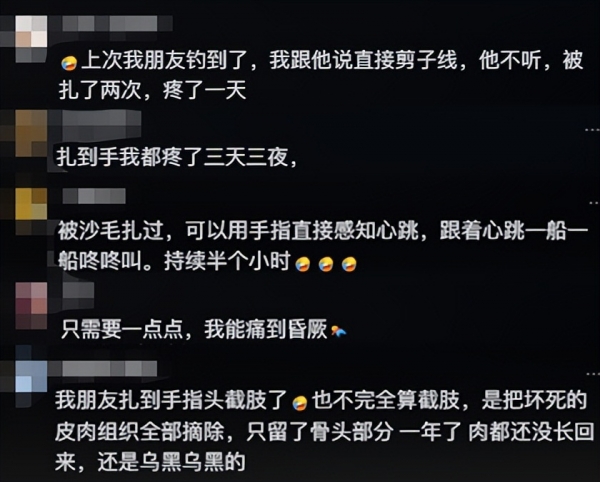 网友们完全不怀疑男子是"戏精",大家纷纷表示理解,因为沙毛鱼就是有毒刺的,被它的毒刺扎了确实会非常痛!不少网友分享了自己的经历,有人被扎一下痛了3天3夜;有网友被扎后,感觉伤口处一跳一跳的;还有网友说自己的朋友被扎后手指头截肢了!坏死的皮肉组织都被摘除,只剩下骨头,一年了肉都没长出来!