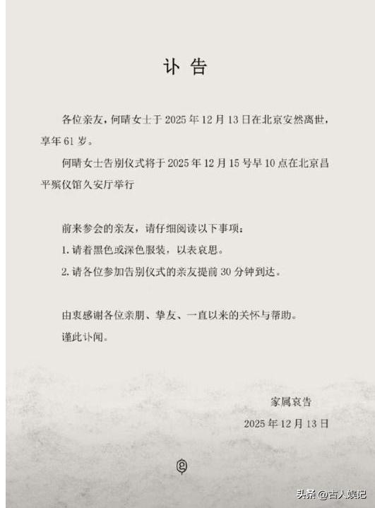 消息传出后,曾与她同在《西游记》剧组的六小龄童在社交平台发文 "何晴同学,一路走好"。