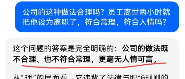 这违背了法律与职场规则的基本逻辑,企业应先配合家属处理善后事宜,协助有关部门调查,而不是着急的"切割关系",另外从他的过往来看,在公司里面呕心沥血,每天埋头苦干,没有功劳也有苦劳。如今人不在了,应该有最基本的缓冲和尊重,短时间内就完成了离职操作,违背了社会共识。