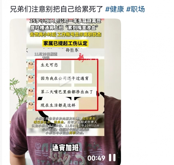 关于他的死亡原因,家属跟公司产生了分歧,公司方面认为,他是自行摔伤的,而家属后续通过梳理他出事之前的工作状态,发现在最近4个月的时间里,每天平均的工作时长都在13小时左右,最高的时候,甚至达到了14.8个小时,而且还发现,他曾经跟朋友吐槽工作累,甚至已经累到连嘴角都有血丝了,还流鼻血。