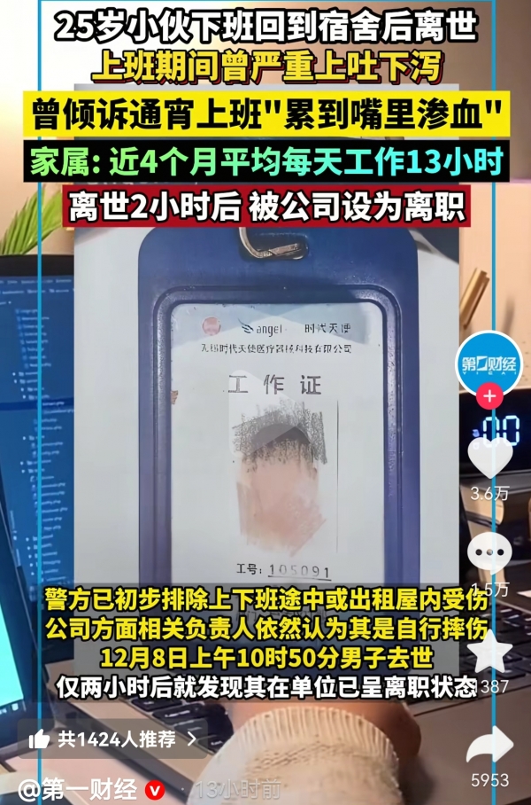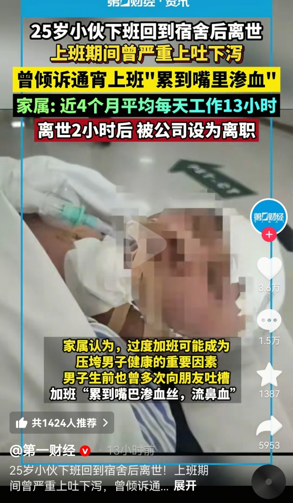一名年仅25岁的小伙,在下班回到宿舍之后离世,引发社会广泛关注,更让家属陷入了巨大的悲痛之中,然而在他去世两小时之后,公司就将他设为了离职的状态。