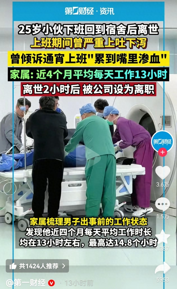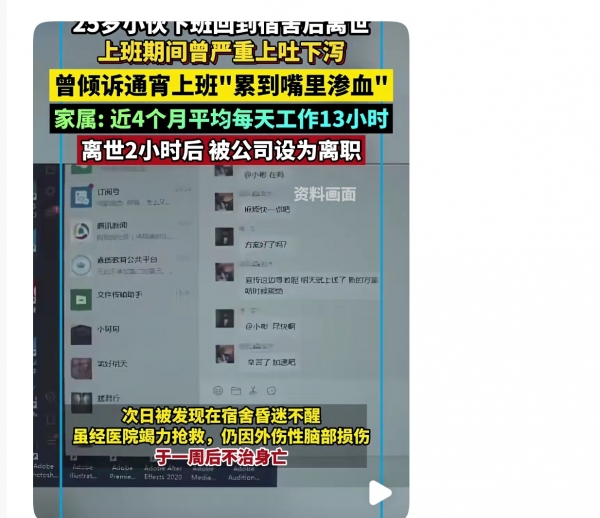 如此冷漠的做法,遭到无数网友的严厉谴责,后来家属发现,他每天的工作时间都很长,已经严重超出了法定的8小时,而且在上班期间,他还有过上吐下泻的症状,并且向朋友吐槽过,"累到嘴里渗血。"
