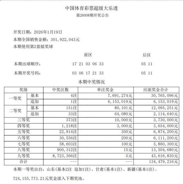 本期大乐透开出 4注一等奖,花落 3地,每注759 万,一等奖出自山东(基本2注 追加1注)、甘肃(基本1注)、新疆(基本1注) 。 二等奖151 注,每注奖金8 万!三等奖373 注,每注10000元,四等奖1218注,每注奖金3000元。本期开奖结束后奖池资金为7.24 亿。。